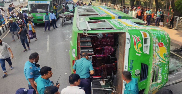 রাজধানীতে আইল্যান্ডে ধাক্কা খেয়ে উল্টে গেল বাস
