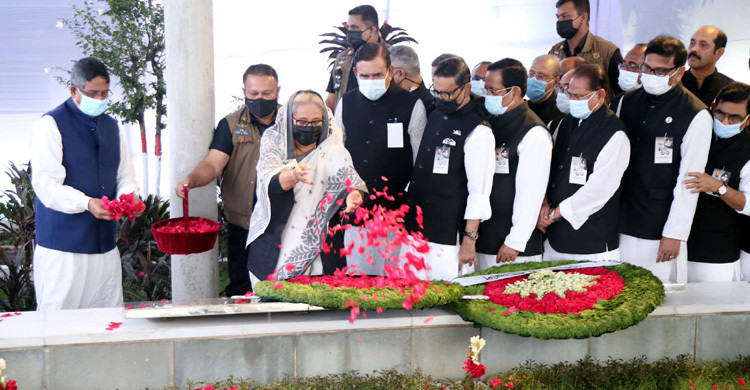 বঙ্গবন্ধুর প্রতিকৃতি ও জাতীয় ৪ নেতার কবরে প্রধানমন্ত্রীর শ্রদ্ধা নিবেদন