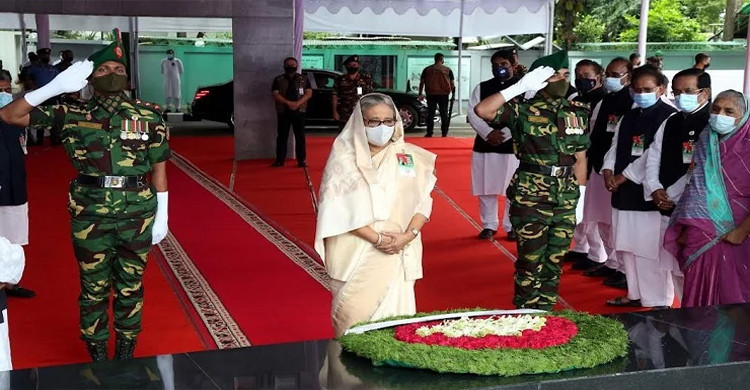 বঙ্গবন্ধুর প্রতিকৃতিতে প্রধানমন্ত্রীর শ্রদ্ধা