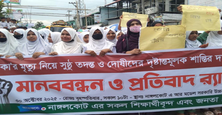নাঙ্গলকোটে মনিকা'র মৃত্যু নিয়ে সুষ্ঠু তদন্ত ও দোষীদের দৃষ্টান্তমূলক শাস্তির দাবিতে মানববন্ধন