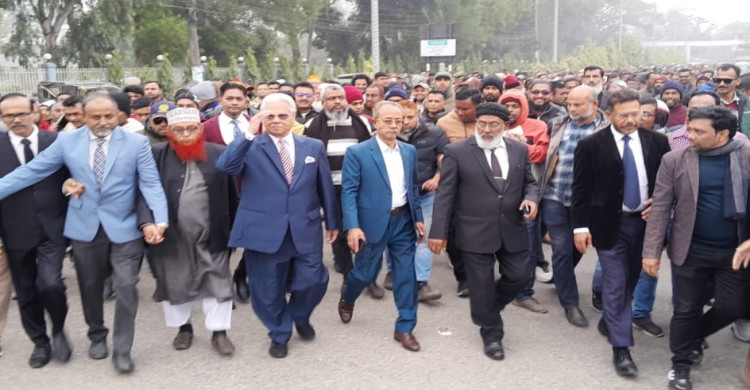 ঠাকুরগাঁওয়ে দোকান ঘর উচ্ছেদের প্রতিবাদে স্থানীয় ব্যবসায়ীদের মানববন্ধ