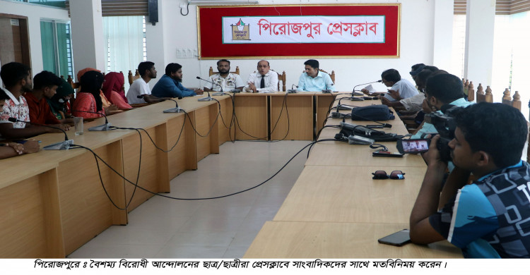 পিরোজপুর প্রেসক্লাবের সাংবাদিকদের সাথে মতবিনিময় করেছে বৈষম্যবিরোধী আন্দোলনকারী ছাত্র/ছাত্রীরা।পিরোজপুর প্রেসক্লাব মিলনায়তনে এ মতবিনিময়ের আয়োজন করা হয়।