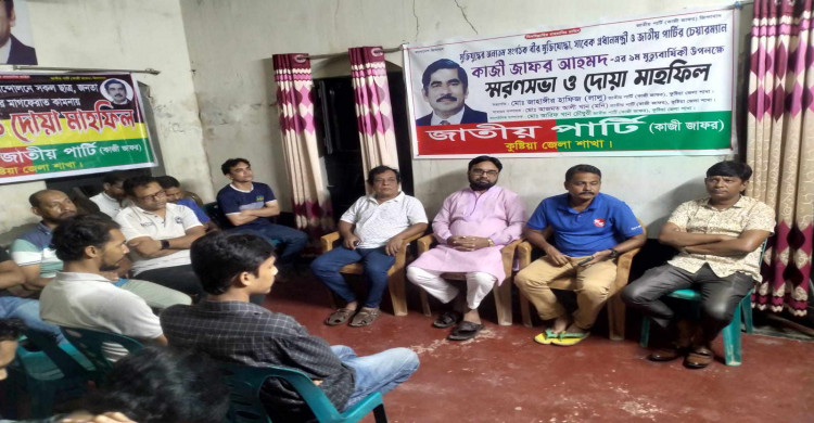 মুক্তিযুদ্ধের অন্যতম সংগঠক বীর মুক্তিযোদ্ধা সাবেক প্রধানমন্ত্রী ও জাতীয় পার্টির চেয়ারম্যান কাজী জাফর আহমদ-এর ৯ম মৃত্যুবার্ষিকী উপলক্ষে জাতীয় পার্টি কাজী জাফর এর জেলা শাখার কার্যালয়ে স্মরণসভা ও দোয়া মাহফিলের আয়োজন করা হয়। অনুষ্ঠানে তার জীবনের বিভিন্ন দিক নিয়ে আলোচনা হয়। উক্ত আলোচনা অনুষ্ঠানে বিশেষ অতিথি হিসেবে উপস্থিত ছিলেন কুষ্টিয়া জেলা বিএনপির সাংগঠনিক সম্পাদক জনাব মোঃ শামিম উল হাসান অপু। সভাপতিত্বে ছিলেন কুষ্টিয়া জেলা জাতীয় পার্টি কাজী জাফর এর সভাপতি মোঃ জাহাঙ্গীর হাফিজ লালু। অন্যান্যদের মধ্যে আলোচানায় ছিলেন, সাধারণ সম্পাদক মোঃ আজমত আলী খান মনি, সাংগঠনিক সম্পাদক আরিফ খান চৌধুরী, যুবসংহিতর আহবায়ক শেখ ইউসুফ রেজা রানা, জাতীয় ছাত্র সমাজের সভাপতি মোঃ মাহফুজ রহমান জাহিদ (লেখক), জেলা কমিটির অন্যতম সদস্য মোঃ কবিরউদ্দিন, মিরপুর উপজেলা কমিটির যুগ্ম সাধারণ সম্পাদক মোঃ মুজিবুল হক খান উপজেলা কমিটির সদস্য মোঃ সুজাউদ্দৌলা রাজু, মোঃ শামীম হোসেন,। অংশ নেন মোঃ মামুন, মোঃ আব্দুল মান্নান, নাজমুল হাসান খান মোঃ সিহাব আহমেদ সহ আরও অনেকে। অনুষ্ঠান সঞ্চালনায় ছিলেন, আরিফ খান চৌধুরী।