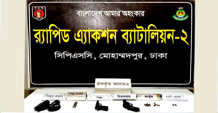 র্যাব জানায়, অবৈধ অস্ত্র উদ্ধারে দেশে বিশেষ অভিযান শুরু হয়েছে। এরই ধারাবাহিকতায় গোপন তথ্যের ভিত্তিতে র্যাব-২-এর একটি আভিযানিক দল মঙ্গলবার রাত ২টায় রাজধানীর মোহাম্মদপুর থানার ঢাকা উদ্যানের নদীর পাড় এলাকা থেকে পরিত্যক্ত অবস্থায় ১টি বিদেশি পিস্তল, ১টি বিদেশি রিভলবার, ৯ রাউন্ড গুলি, ২টি খালি গুলির খোসা ও ২টি পিস্তলের কভার উদ্ধার করে।