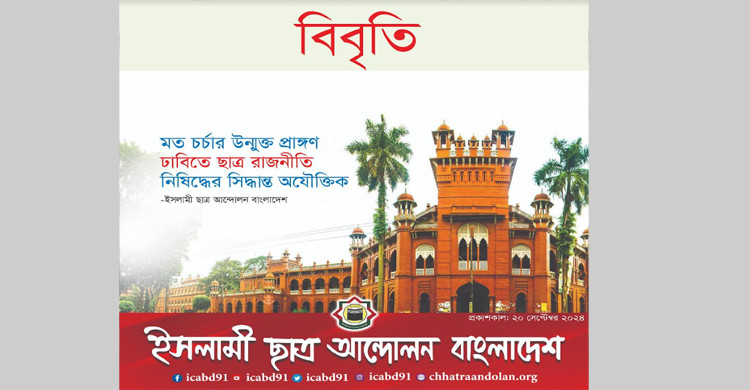মত চর্চার উন্মুক্ত প্রাঙ্গণ ঢাবিতে ছাত্র রাজনীতি নিষিদ্ধের সিদ্ধান্ত অযৌক্তিকঃ ইসলামী ছাত্র আন্দোলন