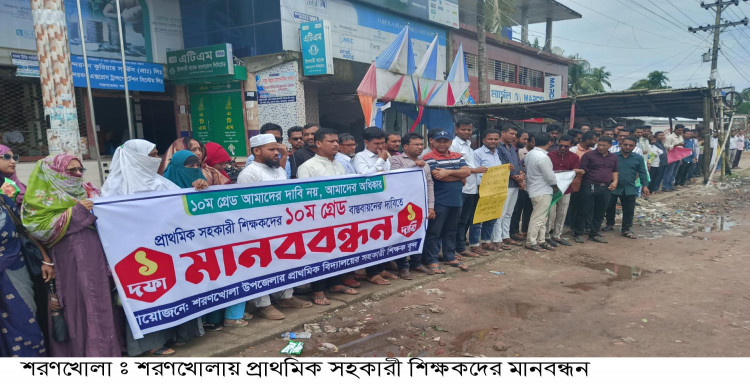 শরণখোলায় শনিবার সকালে সরকারি প্রাথমিক বিদ্যালয়ের সহকারী শিক্ষকরা ১০ম গ্রেড বাস্তবায়নের দাবীতে মানববন্ধন করেছেন।