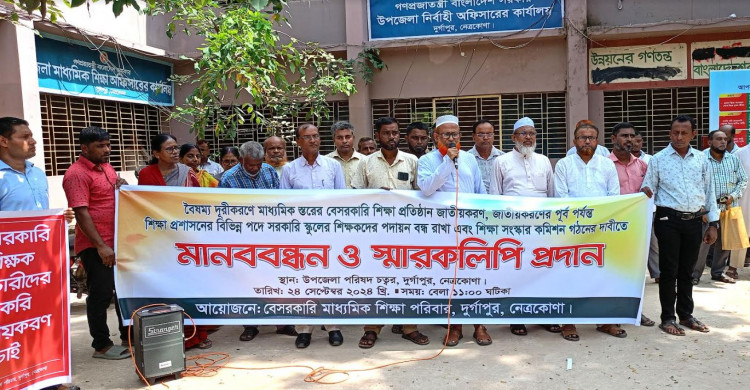 মাধ্যমিক শিক্ষা জাতীয়করণ, শিক্ষা প্রশাসনের বিভিন্ন পদে সরকারি স্কুলের শিক্ষকদের পদায়ন বন্ধ রাখা এবং সংস্কার কমিটি গঠনের দাবিতে নেত্রকোনার দুর্গাপুর উপজেলায় কর্মরত শিক্ষকরা মানববন্ধন করেছেন। মঙ্গলবার (২৪ সেপ্টেম্বর) দুপুরে উপজেলা পরিষদ চত্ত্বরে এ মানববন্ধন অনুষ্ঠিত হয়।