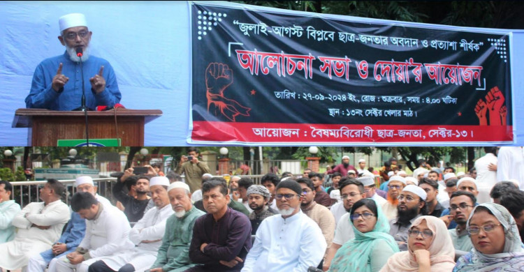 জুলাই-আগস্ট বিপ্লবে ছাত্র-জনতার অবদান ও প্রত্যাশা শীর্ষক আলোচনা সভা ও দোয়া অনুষ্ঠিত হয়েছে। শুক্রবার (২৭ সেপ্টেম্বর) বিকালে রাজধানী উত্তরার ১৩নং সেক্টরে এ আলোচনা সভার আয়োজন করা হয়। অনুষ্ঠানটির আয়োজন করে বৈষম্যবিরোধী ছাত্র-জনতা সেক্টর-১৩।