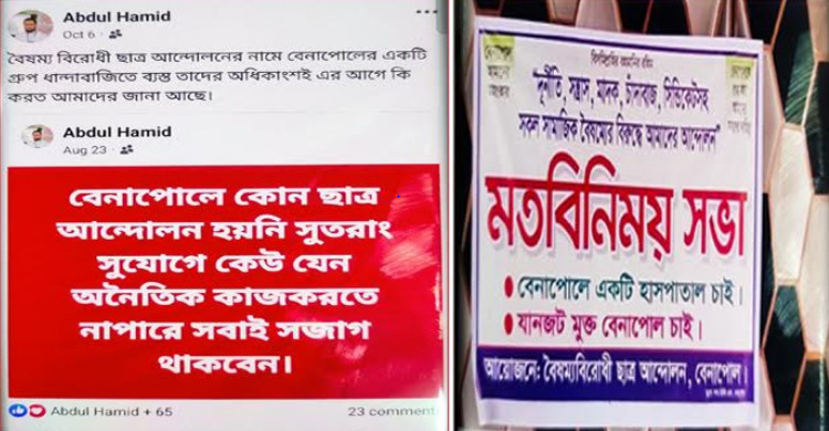 রবিবার (১৩ অক্টোবর) সকালে বৈষম্যবিরোধী ছাত্র আন্দোলনের যশোরের প্রতিনিধি আবু সাঈদ সাংবাদিকদের বই বিক্রেতা হামিদ কর্তৃক অপপ্রচার ছড়ানোর বিষয়টি নিশ্চিত করে জানান, গত ৫ আগস্ট স্বৈরাচার আওয়ামী লীগ সরকারের পতনের পর বেনাপোলের ছাত্রসমাজ ও বৈষম্যবিরোধী আন্দোলনে বেনাপোলের প্রতিনিধিরা দেশের আকস্মিক বন্যপরবর্তী কার্যক্রমসহ বেনাপোলের যানজট নিরসন ও আধুনিক বেনাপোল গড়ার লক্ষ্যে সুনামের সহিত নিরলসভাবে কাজ করে যাচ্ছে। তাদের এই কাজকে বাধাগ্রস্ত করতে কতিপয় কুচক্রী মহল ব্যক্তিস্বার্থ হাসিলে বা নিজ রাজনৈতিক ফয়দা লুটতে ষড়যন্ত্রে লিপ্ত। এরই অংশ হিসেবে সামাজিক যোগাযোগমাধ্যম ফেসবুকে আব্দুল হামিদ নামে আইডি হতে বৈষম্যবিরোধী ছাত্র আন্দোলন, বেনাপোলের নাম ব্যবহার করে ব্যানারের ছবি তুলে পোস্ট ছেড়ে অপপ্রচারের অংশ হিসেবে বিরূপ মন্তব্য লেখালেখি করা হচ্ছে।