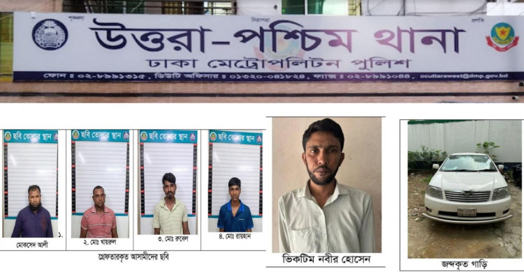 তথ্যপ্রযুক্তির সহায়তায় উত্তরা পশ্চিম থানা পুলিশ উত্তরা ৭নং সেক্টর হতে অপহরণের শিকার নবীর হোসেন (৩৬), পিতা-আমির হোসেন, মাতা-হনুফা বেগম, সাং-বজুরিখোলা, স্বর্ণকার বাড়ী, থানা-কচুয়া, জেলা-চাঁদপুর, এ/পি-বাসা নং-৭৭, লেক ড্রাইভ রোড, সেক্টর নং-০৭, থানা-উত্তরা পশ্চিম, ঢাকা কে তুরাগ থানাধীন যাত্রাবাড়ি এলাকা হতে উদ্ধার করেছে এবং অপহরনের ঘটনায় জাড়িত ০১। মোঃ মোকসেদ আলী (৩৬), পিতা-মৃত-সুরুজ আলী, মাতা-জাহানারা বেগম, সাং-চরশেরপুর নয়া পাড়া, মুকুল হাজীর বাড়ী, থানা-শেরপুর সদর, জেলা-শেরপুর, এ/পি-আলিফ এর বাসার ভাড়াটিয়া, ফ্ল্যাট নং-বি/৩, মসজিদ রোড, যাত্রাবাড়ী, থানা-তুরাগ, ঢাকা, ০২। মোঃ খায়রুল (৩৭), পিতা-নূর মোহাম্মদ, মাতা-জোবেদা খাতুন, সাং-গোপালপুর, থানা-নাগেশ^রী, জেলা-কুড়িগ্রাম, এ/পি-জহিরের বাসার ভাড়াটিয়া, যাত্রাবাড়ী, থানা-তুরাগ, ঢাকা, ০৩। মোঃ রুবেল (২৬), পিতা-হাতেম শেখ,মাতা-আজিরন বেগম, সাং-পেচারচর, আবেদ আলী ডাক্তার বাড়ী, থানা- ইসলামপুর, জেলা-জামালপুর, এ/পি-রশিদ এর বাসার ভাড়াটিয়া, তারা মসজিদের পিছনে, পাকুরিয়া, থানা-তুরাগ, ঢাকা, ০৪। মোঃ রায়হান (১৯), পিতা-মোঃ আবু হানিফ, মাতা-মোছাঃ রুপালী বেগম, সাং-হোসেন খিলা মুন্সি বাড়ী, থানা-শেরপুর সদর, জেলা-শেরপুর, এ/পি-আলিপ এর বাসার নীচ তলার ভাড়াটিয়া, যাত্রাবাড়ী, থানা-তুরাগ, ঢাকাদেরকে গ্রেফতার করা হয়েছে।