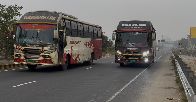 ঘন কুয়াশায় ঢাকা গ্রামীণ জনপদ, মহাসড়কে হেডলাইট জ্বালিয়ে চলছে যানবাহন