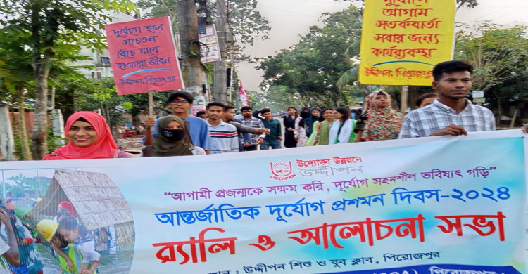 "আগামী প্রজন্মকে সক্ষম করি দুর্যোগ সহনশীল ভবিষ্যৎ গড়ি "এই প্রতিপাদ্য বিষয়কে সামনে রেখে বেসরকারি উন্নয়ন সংস্থা উদ্দীপন জলবায়ু পরিবর্তন ও অভিযোজন প্রকল্প (সি সি এ) আয়োজনে পিরোজপুরে পালিত হয়েছে আন্তর্জাতিক দুর্যোগ প্রশমন দিবস ২০২৪। দিবস টি উপলক্ষে উদ্দীপন বিভিন্ন কর্মসূচি পালন করেছে।