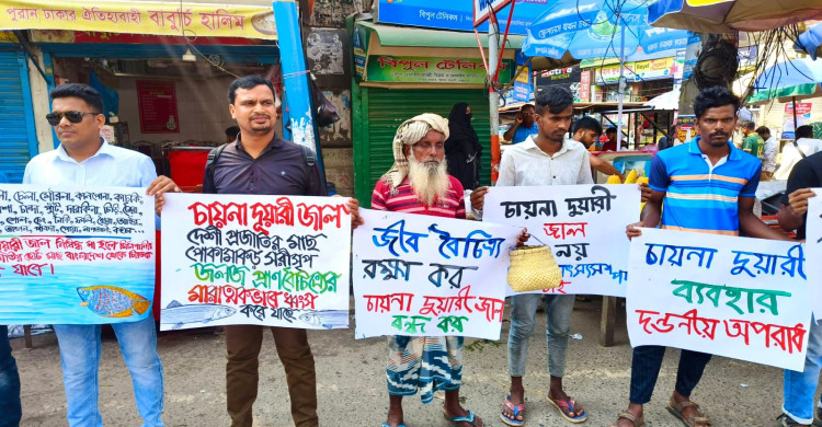 চায়না জাল দিয়ে মাছ ধরা বন্ধের দাবিতে রাজশাহীতে জেলেবন্ধন
