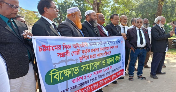 চট্টগ্রামের আইনজীবী সাইফুল ইসলাম আলিফকে হত্যার প্রতিবাদে নেত্রকোনার দুর্গাপুরে মানববন্ধন ও প্রতিবাদ সমাবেশ অনুষ্ঠিত হয়েছে। বৃহস্পতিবার (২৮ নভেম্বর) সকাল ১১টায় দুর্গাপুর চৌকি আদালত চত্বরে এ কর্মসূচির আয়োজন করে দুর্গাপুর আইনজীবী সমিতি।
