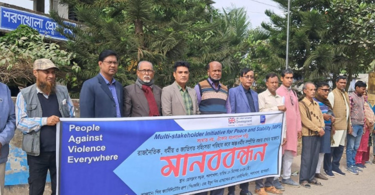 বাগেরহাটের শরণখোলায় রাজনৈতিক, ধর্মীয় ও জাতিগত সহিংসতা পরিহার করে আন্ত:ধর্মীয় সম্প্রীতি বাজায় রাখার আহ্বানে মানববন্ধন কর্মসূচি পালন করা হয়।