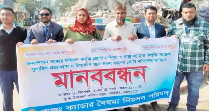 জয়পুরহাটের পাঁচবিবিতে জনপ্রশাসন সংষ্কার কমিশন কর্তৃক শিক্ষা ও স্বাস্থ্য ক্যাডার বিলুপ্তি সংক্রান্ত সুপারিশ প্রত্যাখ্যান ও উপসচিব পদে সকল ধরনের কোটা বাতিলের দাবিতে আজ বৃহস্পতিবার বেলা সাড়ে ১১টায় ক্যাডার বৈষম্য নিরসন পরিষদের আয়োজনে হিলি-পাঁচবিবি-জয়পুরহাট সড়কের পাঁচমাথায় মানববন্ধন অনুষ্ঠিত হয়।