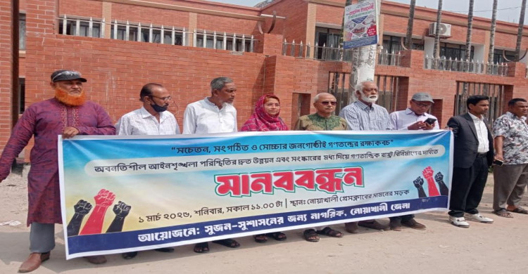 মানববন্ধনে বক্তারা নোয়াখালীসহ সারাদেশে চুরি, ডাকাতি, ছিনতাই, ধর্ষণসহ অবনতিশীল আইনশৃঙ্খলা পরিস্থিতির দ্রুত উন্নয়নে কার্যকর পদক্ষেপ গ্রহণের দাবি জানান। একই সাথে সংস্কার ও নির্বাচনের মধ্য দিয়ে সমাজ বিনির্মাণের দাবি জানান।