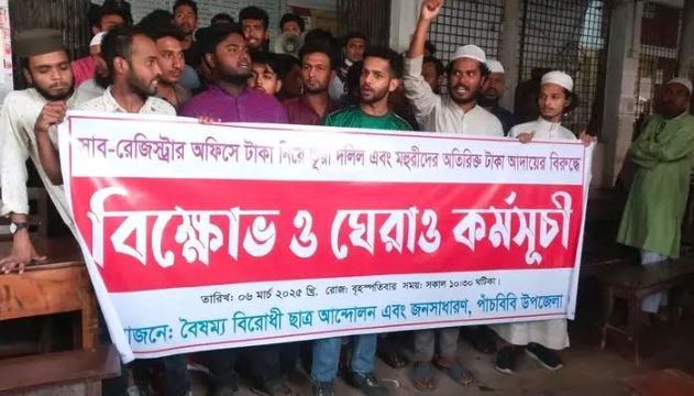 ৬ মার্চ বৃহস্পতিবার ১১ টায় বৈষম্য বিরোধী ছাত্র আন্দোলন পাঁচবিবি উপজেলা শাখা ও সাধারণ জনতার ব্যানারে উপজেলা সাব রেজিষ্ট্রি অফিসের সামনে এ বিক্ষোভ কর্মসূচী পালন করে তারা।এতে বক্তব্য রাখেন বৈষম্য বিরোধী ছাত্র আন্দোলনের জয়পুরহাট জেলা শাখার আহবায়ক হাসিবুল হক সানজিদ, মুর্খ্য সংগঠক নাহিদ, যুগ্ম আহবায়ক আল আমিন ফকির, ফারজান হোসেন, আলিফ, সংগঠক মমো, তাসনিয়া, আনিকা, তাহসিন প্রমুখ।