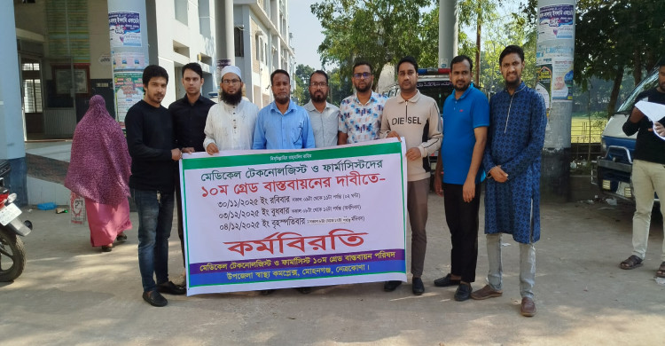 দশম গ্রেডের দাবিতে মোহনগঞ্জে মেডিকেল টেকনোলজিস্ট ও ফার্মাসিস্টদের কর্মবিরতি
