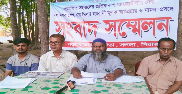 রবিবার (১৩ এপ্রিল) বিকেলে সলঙ্গা ইউনিয়নের বড়গোঁজা মাঝিপাড়া গ্রামে এই সংবাদ সম্মেলন করা হয়। সংবাদ সম্মেলনে ভুক্তভোগী আলহাজ কবির বলেন, আমার পৈত্রিক সম্পত্তি ৭৩ শতাংশ জমি দীর্ঘ ৫৭ বছর যাবত আমাদের গ্রামের মৃত দছের শেখের ছেলে আওয়ামীলীগ নেতা গোলবার হোসেন অবৈধ ভাবে জোরপূর্বক ভোগ দখল করে আসছিল। পরে আমাদের জামির দলিল ও কাগজপত্র দেখে আমাদের জমিতে গেলে। আমাদের পরিবারসহ গ্রামের মাতব্বর ও নেতা কর্মীদের নামে মিথ্যা সংবাদ প্রকাশ করে এবং মিথ্যা মামলা দায়ের করার চেষ্টা করে যাচ্ছে। আমি মিথ্যা সংবাদের তীব্র নিন্দা ও প্রতিবাদ জানাচ্ছি। সেই সাথে সংবাদে বিএনপির নেতাকর্মীদের নামে যে সংবাদ প্রকাশ করা হয়েছে তা সম্পূর্ন ভাবে মিথ্যা বানোয়াট ভিত্তিহীন । সেই সাথে আমার পরিবার ও বিএনপি নেতাকর্মী এবং গ্রামের মাতব্বরা এই ঘটনার সাথে জরিত নাই। তারা সাংবাদিকদের মিথ্যা তথ্য দিয়ে সংবাদটি পরিবেশন করেছেন। এমন কোন ঘটনা আদোও ঘটেনি। আমি সাংবাদিক ভাইদের মধ্যমে প্রশাসনের কাছে দাবি করছি আমার পৈত্রিক সম্পত্তির কাগজপত্র দেখে আমাদের দাবিকৃত জমি ন্যায় বিচারের মাধ্যমে জমিটি আমাদের বুঝিয়ে দিতে সহযোগিতা করবেন।