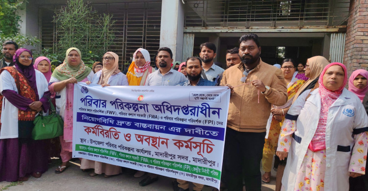 প্রস্তাবিত নিয়োগবিধি বাস্তবায়নের দাবিতে মাদারীপুরে স্বাস্থ্য সহকারীদের কর্মবিরতি