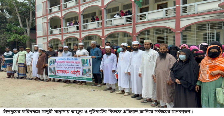 চাঁদপুরে মাদ্রাসায় ভাংচুর-লুটতরাজের প্রতিবাদে মানববন্ধন