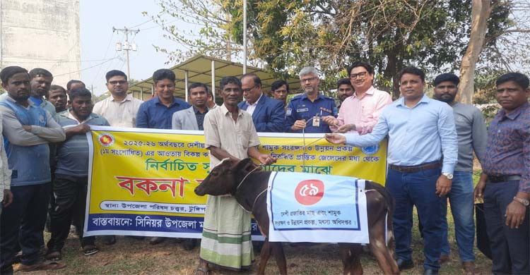 দেশীয় মাছ ও শামুক সংরক্ষণে টুঙ্গিপাড়ায় ৬০ জেলের মাঝে বকনা বাছুর বিতরণ