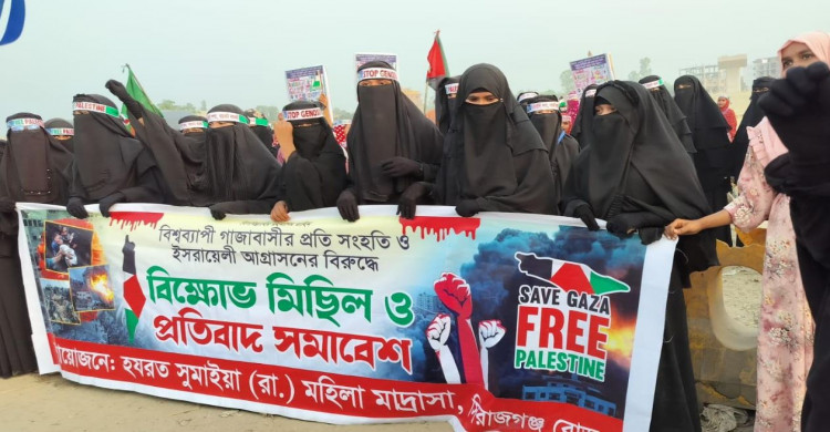 মুসলমানদের গণহত্যার প্রতিবাদে ইসরায়েলের বিরুদ্ধে সলঙ্গায় মহিলা মাদ্রাসার শিক্ষার্থীদের বিক্ষোভ