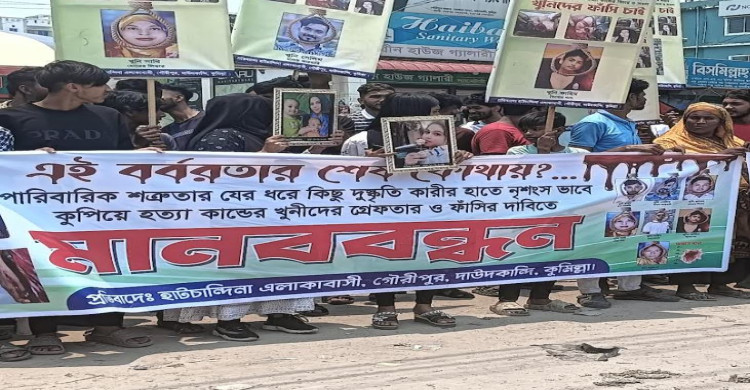 কুমিল্লা দাউদকান্দি গৌরিপুর এলাকায় পারিবারিক শত্রুতার জেরে প্রকাশ্যে খুন হওয়া গৃহবধু শামীমা আক্তারের হত্যাকারীদের দ্রুত গ্রেপ্তার ও ফাঁসির দাবিতে মানববন্ধন করেছেন এলাকাবাসী।