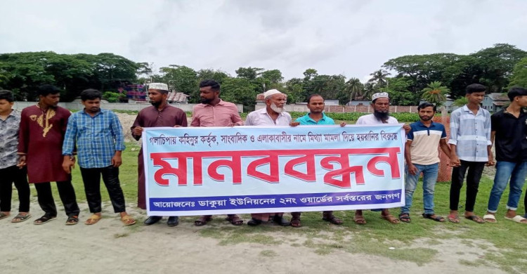 পটুয়াখালীর গলাচিপায় সাংবাদিক সহ এলাকাবাসীর বিরুদ্ধে মিথ্যা মামলা প্রত্যাহারের দাবিতে মানব বন্ধন ও বিক্ষোভ মিছিল অনুষ্ঠিত হয়েছে। রবিবার (১৮ মে) সকাল সাড়ে ১০ টায় উপজেলা নির্বাহী অফিসার চত্বরে এক মানববন্ধন ও পরে ১১ টায় বিক্ষোভ মিছিল অনুষ্ঠিত হয়। সাংবাদিক সোহেল রানা ও এলাকাবাসীর বিরুদ্ধে ডাকুয়া ইউনিয়নের ২ নম্বর ওয়ার্ডের মতিউর রহমানের স্ত্রী মোসা. কহিনুর (৪৫) এর দায়ের করা মিথ্যা এবং হয়রানিমূলক মামলার প্রতিবাদ ও প্রত্যাহারের দাবিতে স্থানীয় সাংবাদিকবৃন্দ ও এলাকাবাসী এ মানব বন্ধন করেন। এ সময় বক্তারা সাংবাদিক সোহেল রানা ও এলাকাবাসীর বিরুদ্ধে করা মিথ্যা মামলা দ্রুত প্রত্যাহারের দাবি জানান। এ সময় উপস্থিত ছিলেন ডাকুয়া ইউনিয়নের সজল মাস্টার, ফজলে আলী প্যাদা, সুশেন চন্দ্র ভূইয়া, মিনারা বেগম, অশোক চন্দ্র ভূইয়া, অবিনাশ চন্দ্র ভূইয়া, সজল চন্দ্র বিশ্বাস, স্বপন চন্দ্র বিশ্বাস, তপন চন্দ্র বিশ্বাস, আসিফ মাঝি, মাসুম হাওলাদার, বিপুল চন্দ্র ভূইয়া, মো. রবিউল ইসলাম, সোহেল রানা, ফারুক প্যাদা, ফজলু মৃধা সহ আরো অনেকে। এ সময় বক্তারা অবিলম্বে সাংবাদিক সোহেল রানা ও এলাকাবাসীর বিরুদ্ধে হয়রানিমূলক মামলা প্রত্যাহার ও মামলাবাজ মোসা. কহিনুর এবং তার সহযোগীর ও পরিবারের বিরুদ্ধে আইনি ব্যবস্থা নেওয়ার দাবি জানান। তাদের মামলা প্রত্যাহার না করা হলে কঠোর কর্মসূচির হুঁশিয়ারি উচ্চারণ করেন। মানববন্ধন ও বিক্ষোভ মিছিল শেষে মানববন্ধনকারীরা জেলা প্রশাসক, পুলিশ সুপার, উপজেলা নির্বাহী অফিসার, সিনিয়র সহকারী পুলিশ সুপার (সার্কেল) গলাচিপা-দশমিনা বরাবরে স্মারক লিপি প্রদান করেন। উল্লেখ থাকে যে, ৮ এপ্রিল মোসা. কহিনুর ডাকুয়া ইউনিয়নে ৫ জনকে আসামী করে একটি মামলা দায়ের করেন। মামলাটি মিথ্যা এবং বানোয়াট। এলাকাবাসী এ মিথ্যা মামলা করায় ক্ষিপ্ত হয়ে ক্ষোভ প্রকাশ করেন। কহিনুরের পরিবারের লোকজনের সাথে মামলার আসামীদের জমিজমা নিয়ে পূর্ব বিরোধ আছে। সেই বিরোধকে কাজে লাগিয়ে কহিনুর হয়রানীমূলক মামলা করেন। যার মামলা নং- ০৬, তারিখঃ ০৮/০৪/২০২৫ ইং।