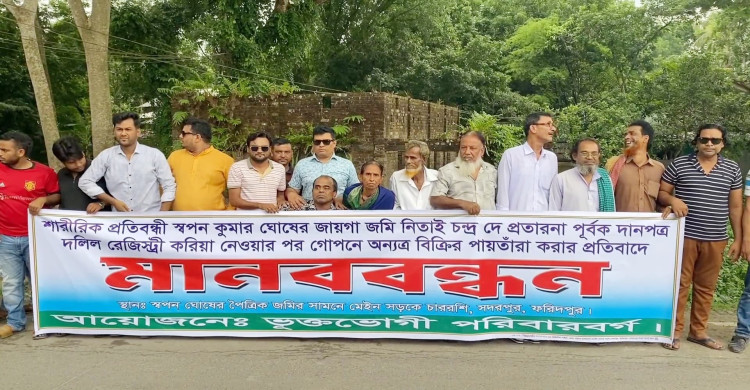 ফরিদপুরের সদরপুর উপজেলায় শারীরিক প্রতিবন্ধী স্বপন ঘোষের জমি-জমা প্রতারণার মাধ্যমে আত্মসাতের অভিযোগ উঠেছে পার্শবর্তী ভাঙ্গা থানার নিতাই চন্দ্র দে নামে এক ব্যাক্তির বিরুদ্ধে। এ ঘটনায় জমি ফেরতের দাবিতে মানববন্ধন করেছে এলাকাবাসী।