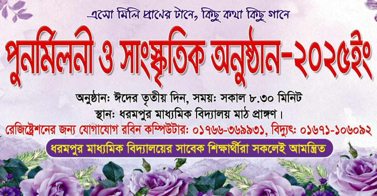 কুষ্টিয়ার ভেড়ামারা থানার ঐতিহ্যবাহী ধরমপুর মাধ্যমিক বিদ্যালয়ের সকল ব্যাচের সাবেক শিক্ষার্থীদের অংশগ্রহণে অনুষ্ঠিত হতে যাচ্ছে সাবেক শিক্ষার্থীদের পুনর্মিলনী অনুষ্ঠান -২০২৫