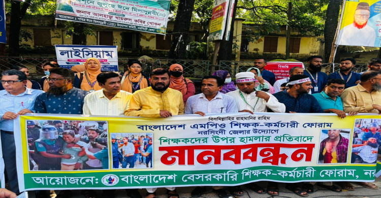 শিক্ষকদের ওপর হামলার প্রতিবাদে নরসিংদীতে মানববন্ধন