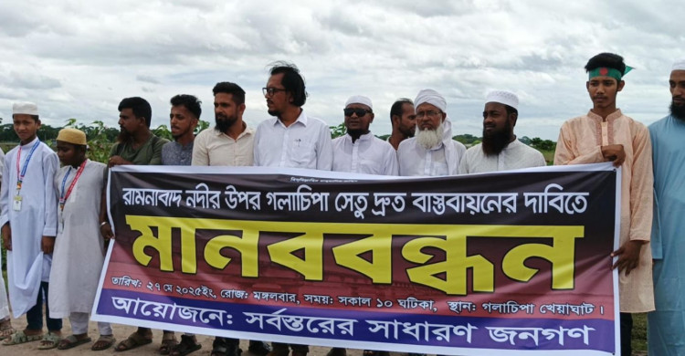 দেশের দক্ষিণ জনপদের পটুয়াখালী জেলার বৃহত্তর ও গুরুত্বপূর্ণ গলাচিপা হরিদেবপুর রামনাবাদ নদীর উপর ব্রিজ নির্মাণের দাবিতে, সর্বস্তরের জনসাধারণের আয়োজনে মঙ্গলবার সকাল দশটায় জনগুরুত্বপূর্ণ গলাচিপা খেয়াঘাট ও ফেরিঘাটের রাস্তায় শতশত নাগরিকদের উপস্থিতিতে বিক্ষোভ মিছিল সহ ঘন্টা ব্যাপী মানববন্ধন অনুষ্ঠিত হয়। বক্তারা সমাবেশে জানান গলাচিপা নদীতে ব্রিজ নির্মাণে বিগত সরকারের সময় একনেক সভায় অনুমোদিত হয়। যোগাযোগ ও সেতু মন্ত্রণালয়ের মাধ্যমে টেন্ডার প্রক্রিয়া স্থান নির্বাচনের কারিগরি রিপোর্ট ও ঊর্ধ্বতন কর্তৃপক্ষের সার্ভে প্রতিবেদন থাকা সত্ত্বেও, সেতু নির্মাণে বিলম্ব হওয়ায় সরকার ও প্রশাসনের কাছে দ্রুত সেতু নির্মাণ বাস্তবায়নের স্বার্থে সর্বস্তরের নাগরিকদের এই মানববন্ধন অনুষ্ঠিত হয়। মানববন্ধন ও সমাবেশে বক্তব্য রাখেন জামায়াতে ইসলামী বাংলাদেশ বরিশাল বিভাগীয় সংগঠক অধ্যাপক মোঃ শাহ আলম মিয়া। উপজেলা জামায়াতে ইসলামী আমির মোঃ জাকির হোসেন, পৌর বিএনপি'র সাবেক সভাপতি মোঃ রফিকুল ইসলাম খান, বিএনপির সাবেক দপ্তর সম্পাদক আব্দুর সোবহান, পৌর বিএনপি'র সাংগঠনিক জিয়াউর রহমান জিয়া, ইসলামী আন্দোলন বাংলাদেশ পৌর শাখার সভাপতি মোঃ নাজমুল হুদা রিপন, শ্রমিক অধিকার পরিষদের সভাপতি মোঃ আমির হোসেন, ছাত্রদের পরিষদের সভাপতি মোঃ আরিফ বিল্লাহ। এছাড়াও আরো উপস্থিত থাকেন গলাচিপা উপজেলার সর্বস্তরের সাধারণ জনগণ, সুশীল সমাজের প্রতিনিধি, বিভিন্ন প্রিন্ট ও ইলেকট্রনিক মিডিয়ার গণমাধ্যম কর্মীবৃন্দ। এ সময় তারা গলাচিপা নদীর উপর সেতু নির্মাণের সমর্থন জানান। সেতুটি নির্মাণ হলে দক্ষিণ জনপদের রাঙ্গাবালী, গলাচিপা দশমিনা ও গলাচিপা উপজেলার প্রায় ১৫ লাখ মানুষের যাতায়াত ব্যবস্থা উন্নতি সহ শিক্ষা, সড়ক পথে দ্রুত পরিবহন কৃষি পণ্য সরবরাহ, স্বাস্থ্য সেবা সহ অর্থনৈতিক অগ্রগতি বৃদ্ধি পাবে বলে জানান।