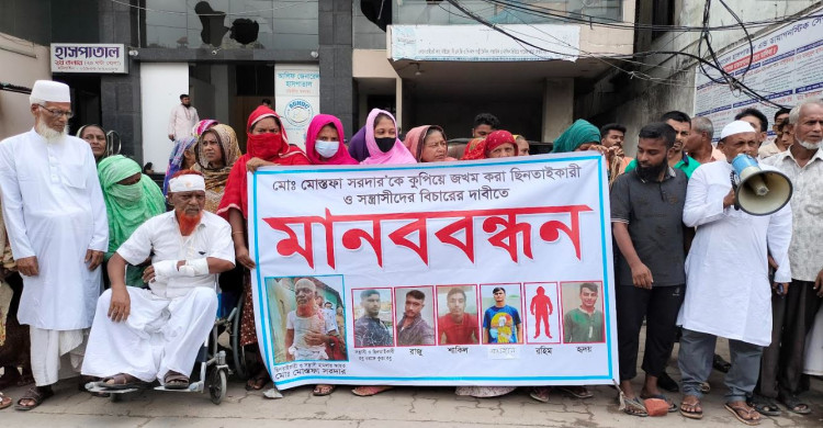 টঙ্গীতে ছিনতাইকারীদের হামলায় আহত ব্যক্তিকে নিয়ে মানববন্ধন।