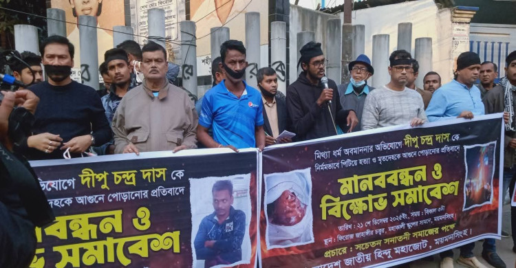দীপু দাসকে হত্যা ও আগুনে পোড়ানোর ঘটনার প্রতিবাদে ময়মনসিংহে মানববন্ধন ও বিক্ষোভ সমাবেশ অনুষ্ঠিত
