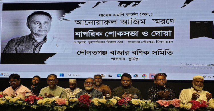 কুমিল্লা-৯ লাকসাম-মনোহরগঞ্জ আসনে চারদলীয় ঐক্যজোট থেকে নির্বাচিত কর্নেল অব. এম. আনোয়ারুল আজিম স্মরণে নাগরিক শোকসভা অনুষ্ঠিত হয়েছে। বৃহস্পতিবার বিকেলে লাকসাম পৌরসভা মিলনায়তনে প্রয়াত এ বিএনপি নেতার শোকসভা ও দোয়া অনুষ্ঠানে লাকসামে ব্যবসায়ী, পেশাজীবীসহ বিভিন্ন শ্রেণী পেশার মানুষ অংশগ্রহণ করেন।