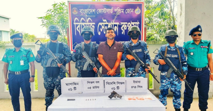 খুলনার সোনাডাঙ্গা থানাধীন জেড.এন.প্যালেস আবাসিক হোটেলে কোস্ট গার্ড, নৌবাহিনী ও পুলিশের সমন্বয়ে পরিচালিত এক যৌথ অভিযানে ১টি বিদেশি পিস্তল, ৫ রাউন্ড পিস্তলের গুলি এবং ৪৭৪ পিস ইয়াবাসহ ১ জন অস্ত্র ও মাদক ব্যবসায়ীকে আটক করা হয়েছে। রবিবার, ১৩ জুলাই ২০২৫ তারিখে কোস্ট গার্ড সদর দপ্তর মিডিয়া কর্মকর্তা লেফটেন্যান্ট কমান্ডার হারুন-অর-রশীদ এই তথ্য জানান।