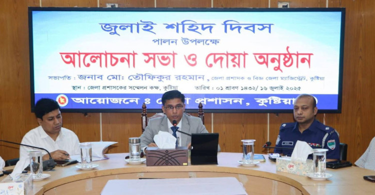 'জুলাই শহীদ দিবস' উপলক্ষে আজ (১৬ জুলাই, বুধবার) কুষ্টিয়া জেলা প্রশাসনের আয়োজনে জেলা প্রশাসকের কার্যালয়ের সভাকক্ষে এক আলোচনা সভা ও দোয়া অনুষ্ঠানের আয়োজন করা হয়।