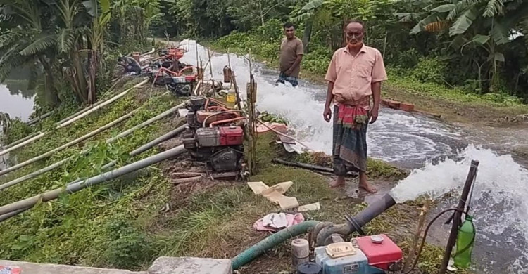 কেউ পানির লাইন কাটছে, কেউ পাইপ মেশিনের সাথে সেট করছেন, অনেকে আবার মেশিন চালানোর জন্য তেলের ব্যবস্থা করছেন। দেখে মনে হচ্ছে দম ফেলার সময় নেই তাদের। তলিয়ে যাওয়া ফসল বাচাতে আপ্রাণ চেষ্টা করে যাচ্ছেন তারা।