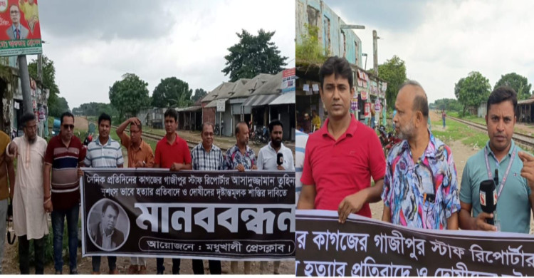 গাজীপুরে দৈনিক প্রিদিনের কাগজের সাংবাদিক আসাদুজ্জামান তুহিনকে নির্মমভাবে হত্যার প্রতিবাদে এবং সারাদেশে সাংবাদিকদের ওপর হামলা ও নির্যাতনের বিরুদ্ধে মধুখালী প্রেসক্লাবের উদ্যোগে মানববন্ধন অনুষ্ঠিত হয়েছে।