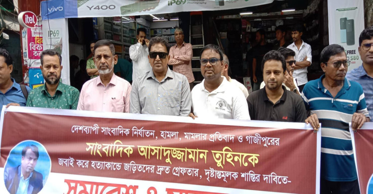 বরগুনায় সাংবাদিক তুহিন হত্যার প্রতিবাদে মানববন্ধন
