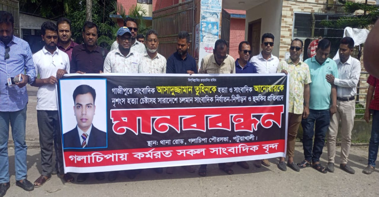 পটুয়াখালীর গলাচিপায় গাজীপুরের সাংবাদিক আসাদুজ্জামান তুহিনকে নৃশংসভাবে হত্যার প্রতিবাদে এবং দেশের বিভিন্ন স্থানে সাংবাদিকদের ওপর চলমান হামলা, নির্যাতন ও হত্যাচেষ্টার বিরুদ্ধে মানববন্ধন অনুষ্ঠিত হয়েছে।