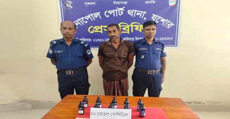 বেনাপোল পোর্টথানার ডিউটি অফিসার এএসআই এমদাদুল ইসলাম জানান, গোপন সংবাদের ভিত্তিতে আজ সকালে বেনাপোল পোর্ট থানাধীন বারপোতা গ্রামস্থ কদমতলা টু বারপোতাগামী রোডস্থ একটি চায়ের দোকানের সামনে পাঁকা রাস্তার উপর অভিযান পরিচালনা করে পায়ের সাথে বিশেষ কায়দায় লুকানো ১০ বোতল ফেনসিডিলসহ তাকে আটক করা হয়। আটক ফেনসিডিলে অনুমানিক বাজার মূল্য ৩০ হাজার টাকা বলে জানান। বেনাপোল পোর্টথানার ভারপ্রাপ্ত কর্মকর্তা (ওসি) রাসেল মিয়া জানান, আটক আসামীর বিরুদ্ধে মাদকদ্রব্য নিয়ন্ত্রণ আইনে মামলা দিয়ে ১০ বোতল ফেনসিডিলসহ যশোর বিজ্ঞ আদালতে সোপর্দ করা হয়েছে।
