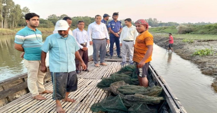 রাণীনগরে অভিযান চালিয়ে আটশ মিটার চায়না দুয়ারী জাল পুড়ে ভূষিবত