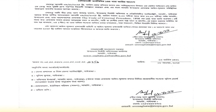 আইন-শৃঙ্খলা অবনতির আশঙ্কায় গাইবান্ধার সাঘাটায় ১৪৪ ধারা জারি