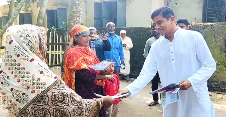 ধানের শীষে ভোট চেয়ে লিফলেট বিতরণ করেন ফরহাদ হোসেন আজাদ