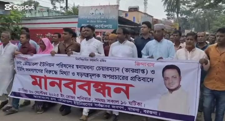 বরগুনায় ভারপ্রাপ্ত চেয়ারম্যানের বিরুদ্ধে মিথ্যা অপপ্রচার করায় মানববন্ধন ও সমাবেশ