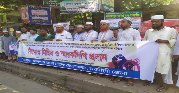বাড়ি-ভাড়া ও উৎসব-ভাতাসহ বিভিন্ন দাবিতে নরসিংদীতে শিক্ষকদের বিক্ষোভ