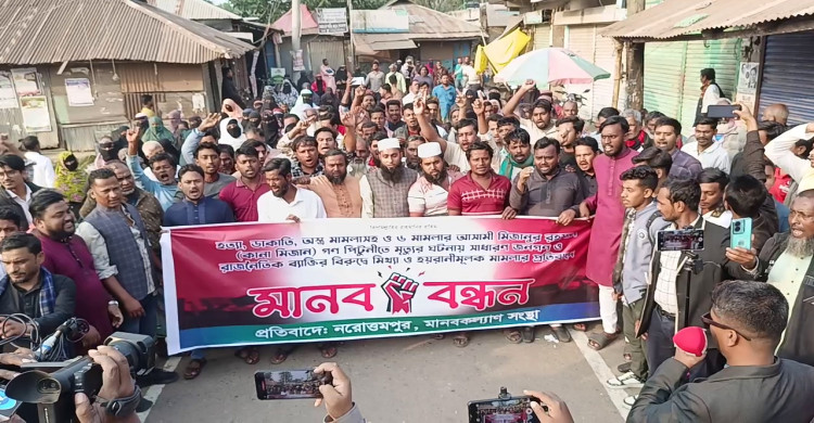 নোয়াখালীতে গণপিটুনিতে ৬ ডাকাতি মামলার আসামীকে হত্যা, মিথ্যা মামলায় জড়ানোর প্রতিবাদে মানববন্ধন